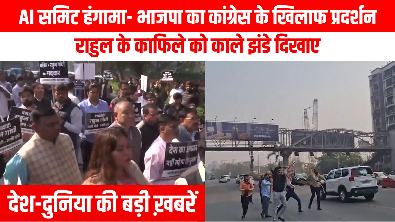 AI समिट हंगामा- भाजपा का कांग्रेस के खिलाफ प्रदर्शन राहुल के काफिले को काले झंडे दिखाए कांग्रेस