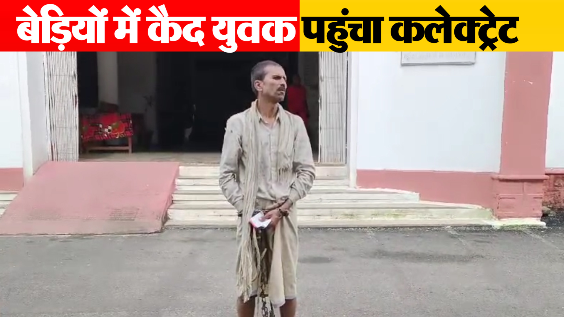 बेड़ियों में कैद युवक पहुंचा कलेक्ट्रेट कलेक्टर परिसर जनसुनवाई में आज एक अजीबो गरीब