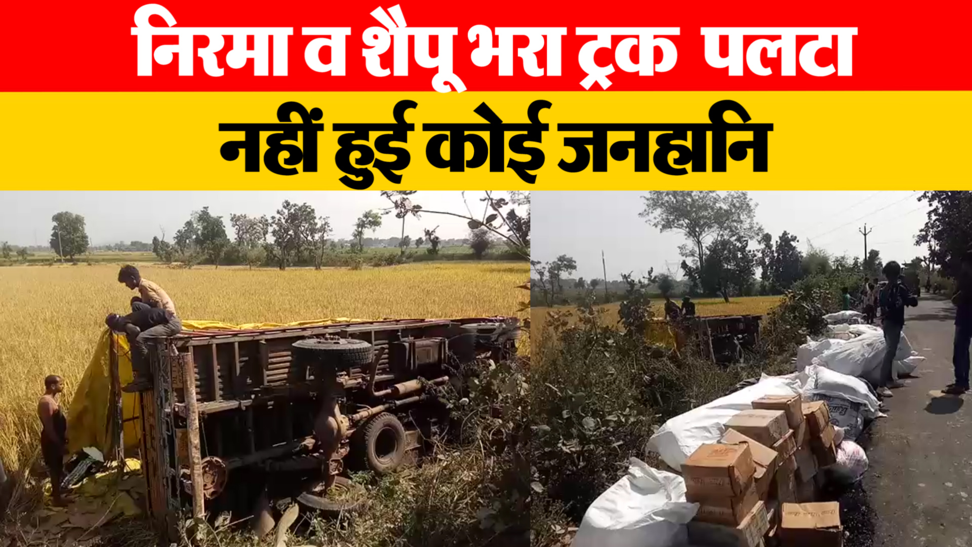 निरमा व शैम्पू भरकर जा रहा ट्रक पलटा नहीं हुई कोई जनहानि निर्दलीय प्रत्याशी विशाल