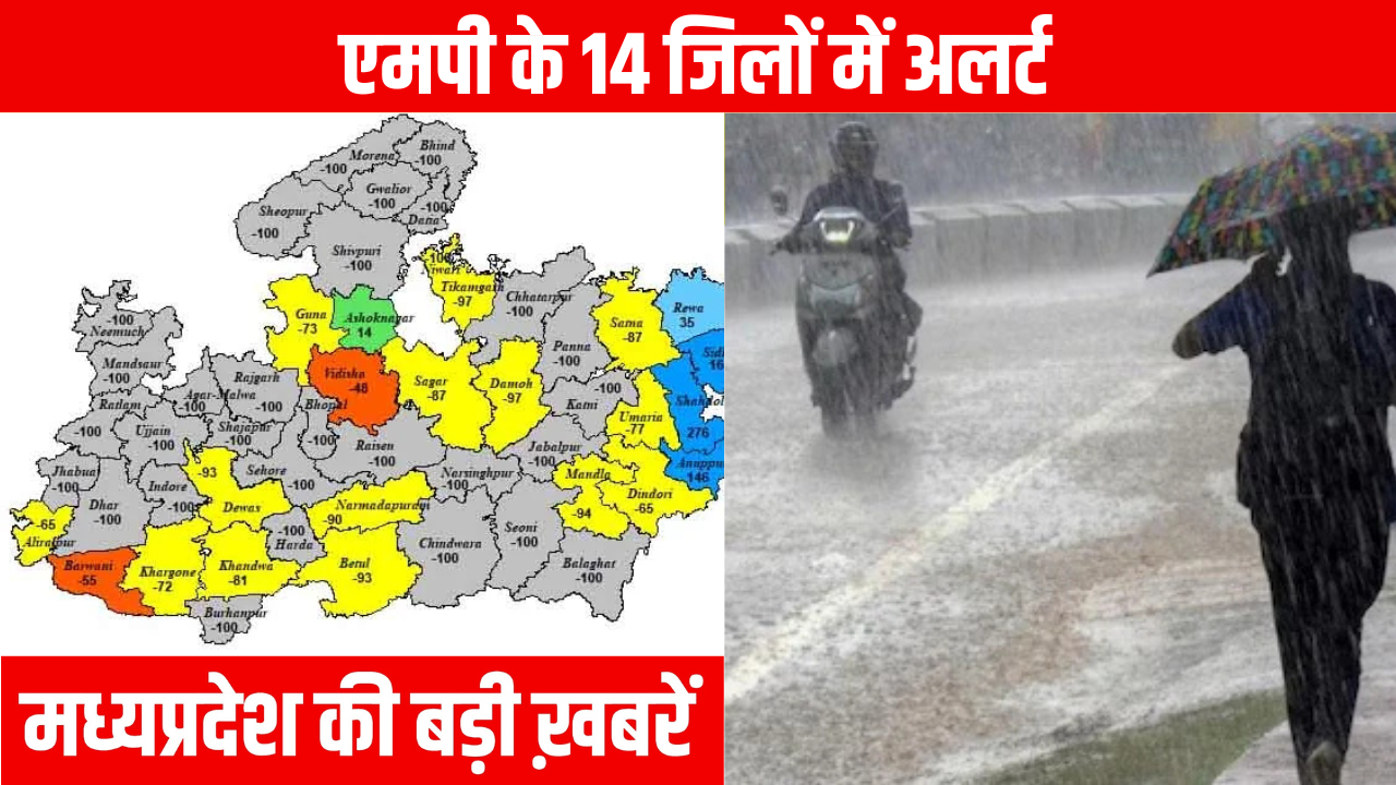 एमपी के 14 जिलों में अलर्ट मध्यप्रदेश के 14 जिलों में सोमवार को तेज बारिश का अलर्ट है। इनमें
